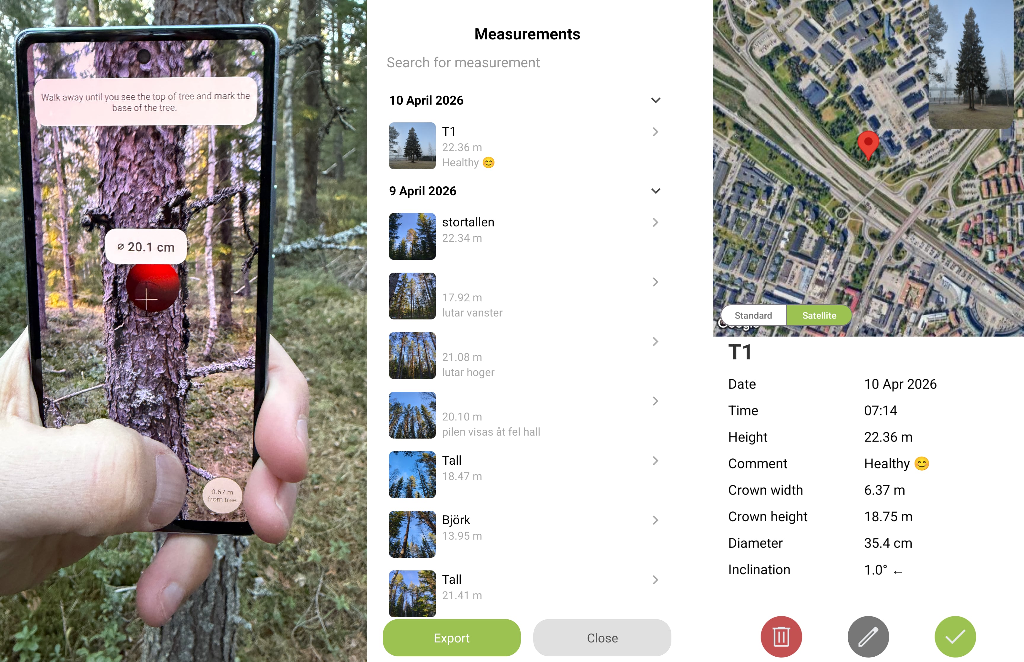 Point your phone at the trunk, mark the edges in AR, and the diameter appears instantly — stored alongside height, crown width, crown height, inclination and GPS location. No caliper. No tape. Just your phone.